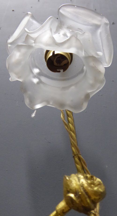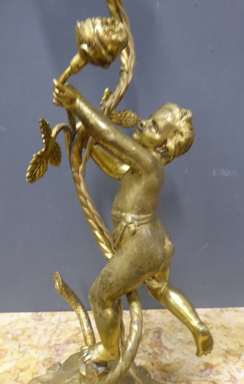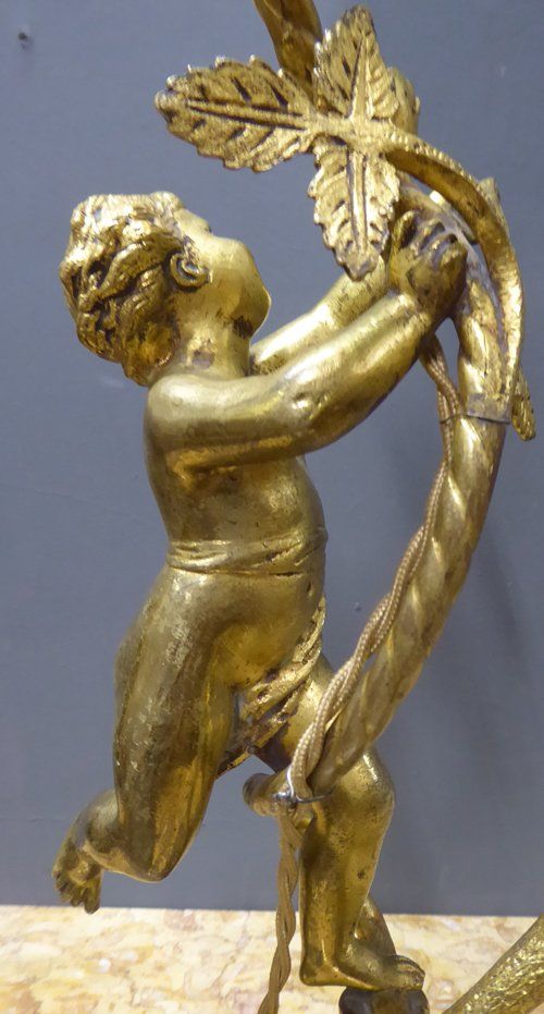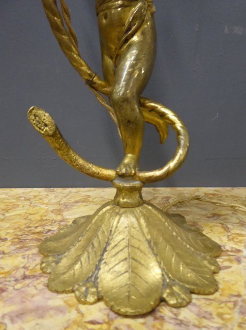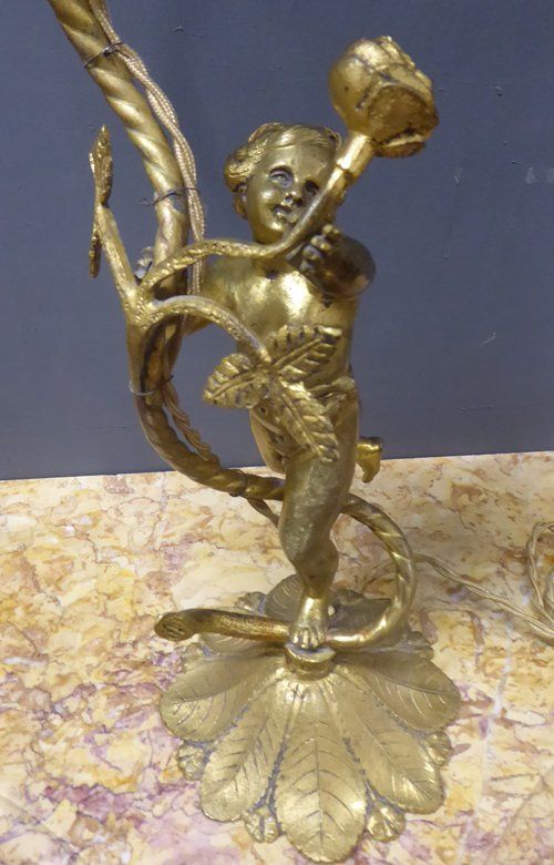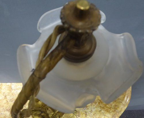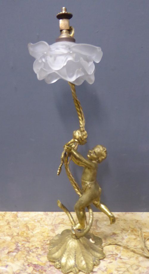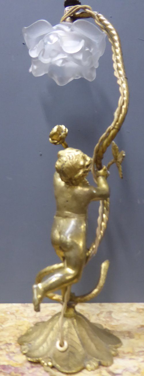 Ref 7327- French ormolu table lamp with cherub decoration. Original glass shade. Old wiring (needs checking). Circa 1930.