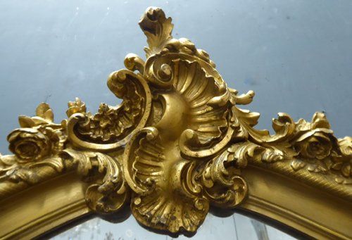Ref 7329 - Antique French Mirror - Gilt on red Louis XV style crested antique mirror. Original patinated bevelled glass. New back. Circa 1890.