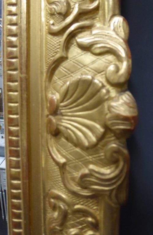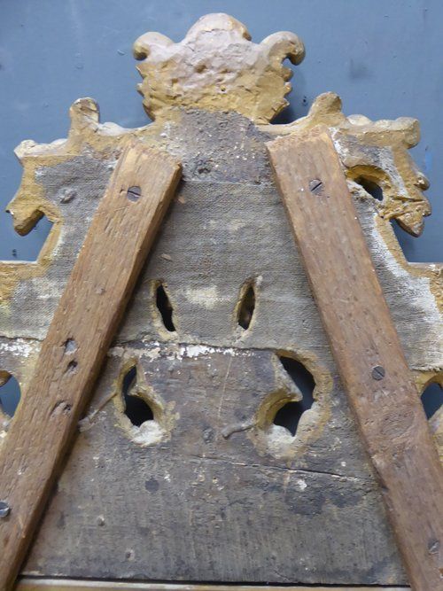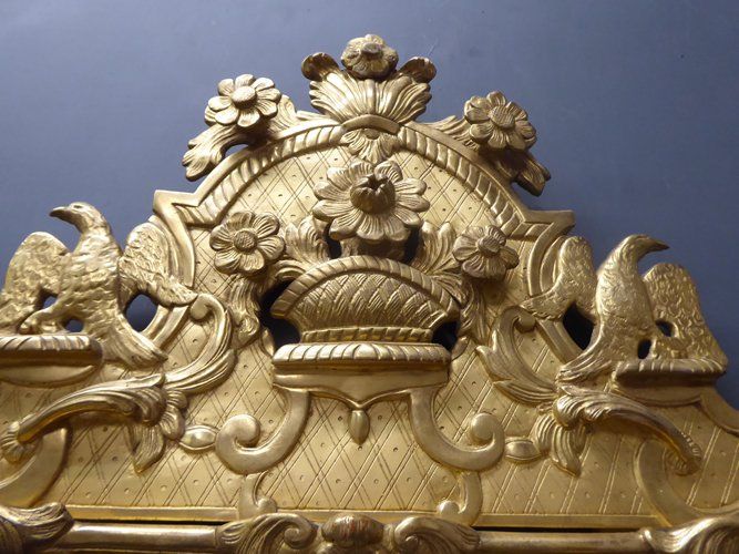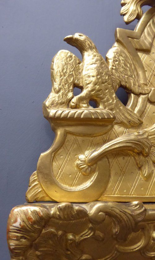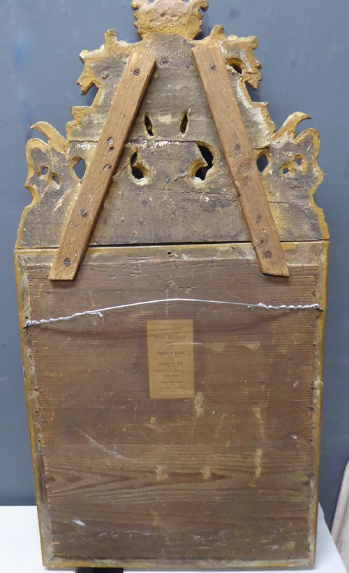 Ref 7333 - Antique French Mirror - Carved giltwood Restoration period crested antique mirror. Some later 19th Century repairs and replaced bevelled glass (circa 1890). Original pine board back. Circa 1820.