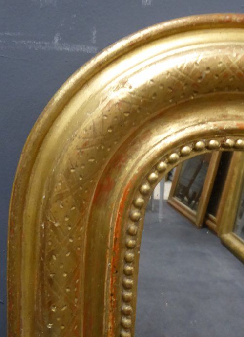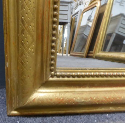 Ref 7334 - Antique French Mirror - Gilt on red Louis Philippe antique mirror with geometric etching to frame. Original glass. Original pine board back with maker's stamp. Circa 1880.