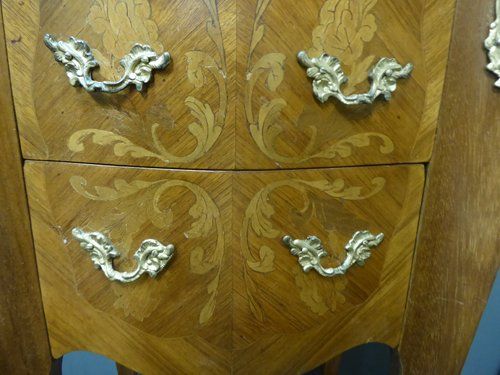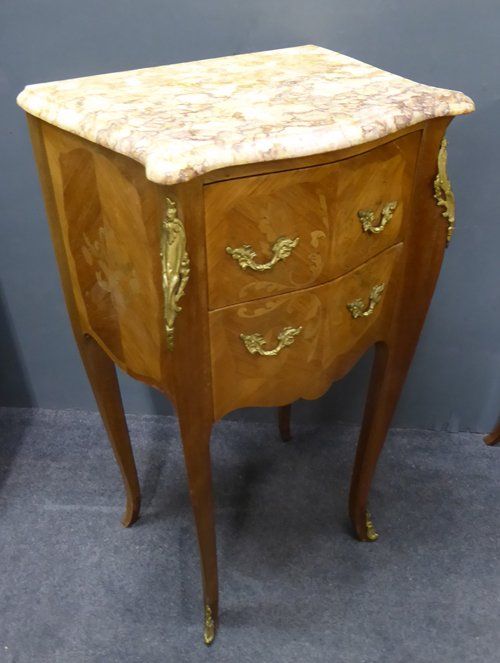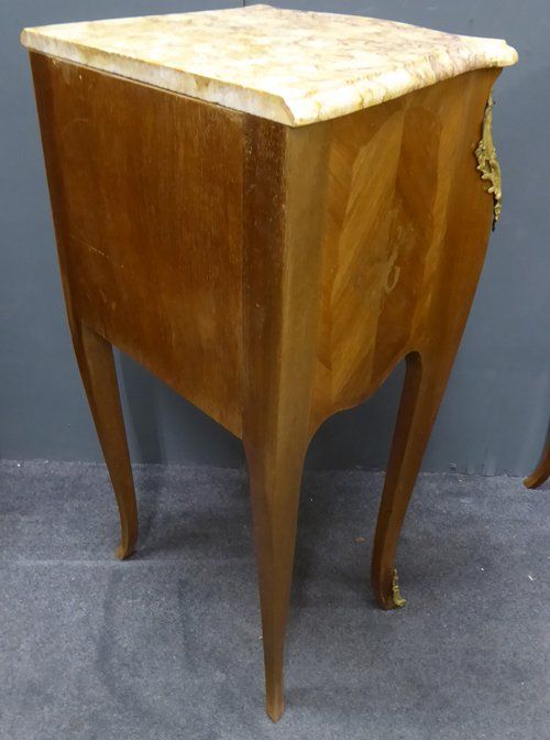 Ref 7339 - Pair of vintage French Louis XV style two drawer inlaid bedside cabinets. Original shaped marble tops and metal fittings. Repair to back left corner of one marble (see close-up). Circa 1950.