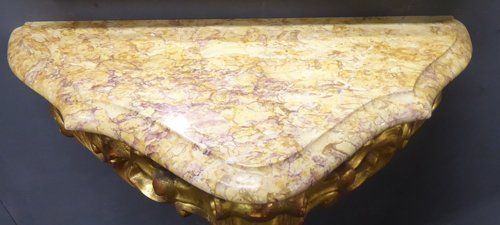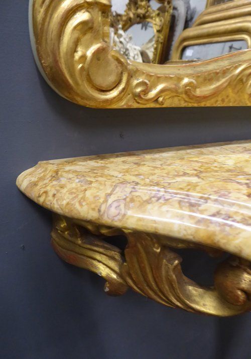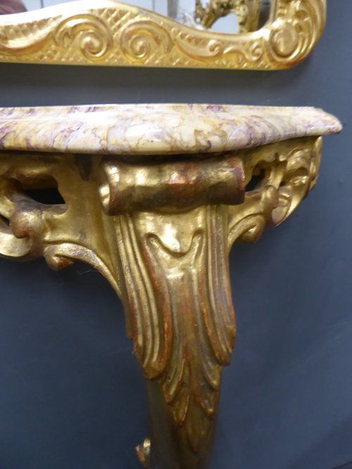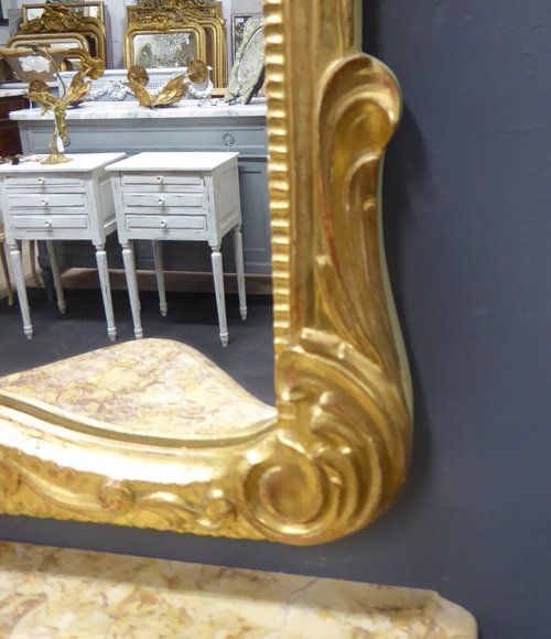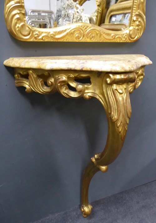 Ref 7345 - French carved giltwood Louis XV style console table and crested mirror with original glass and pine board back. Original marble top. Circa 1950.