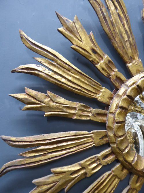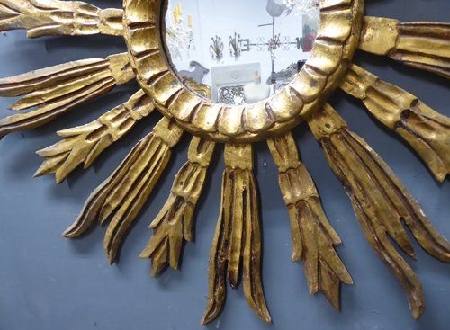 Ref 7359 - Large French carved giltwood sunburst mirror with original glass. Circa 1950.