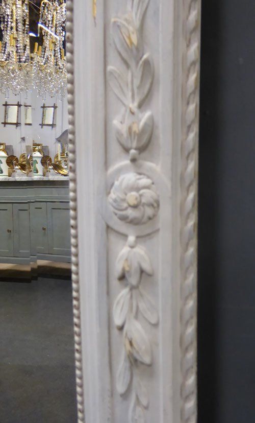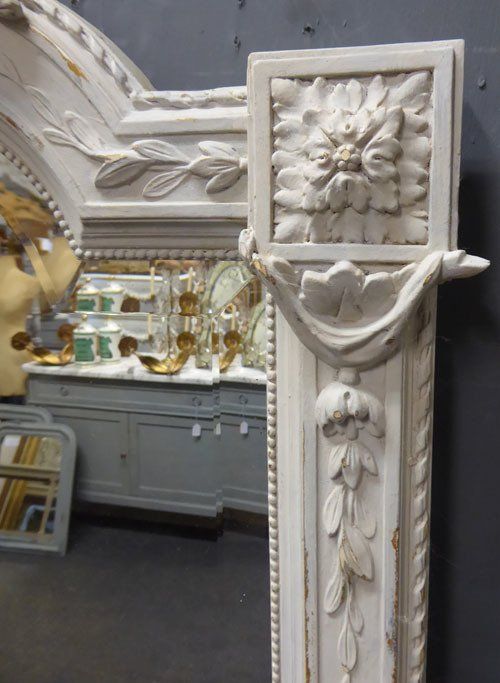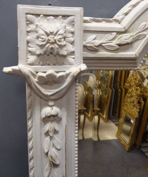 Ref 7372 - Antique French Mirror - Large worn grey painted Louis XVI style garland crested antique mirror. Original bevelled glass with faint manufacturing wipe marks to back of plate. Original pine board back. Circa 1890.