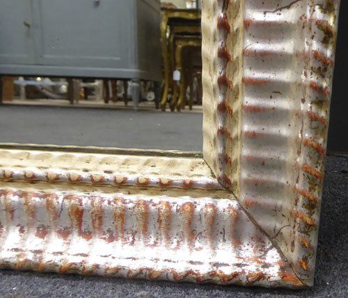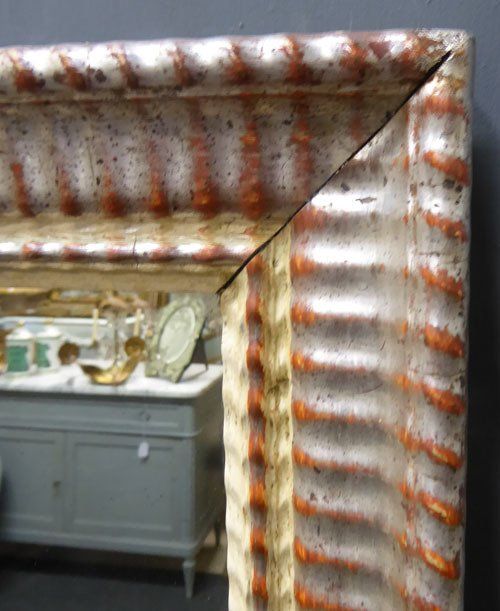 Ref 7379 - Antique French Mirror - Silver on red ripple decorated landscape/portrait antique mirror. Circa 1880 replaced glass with some small black patination spots. Old pine board back. Circa 1830.