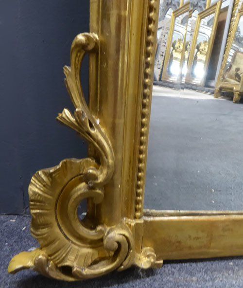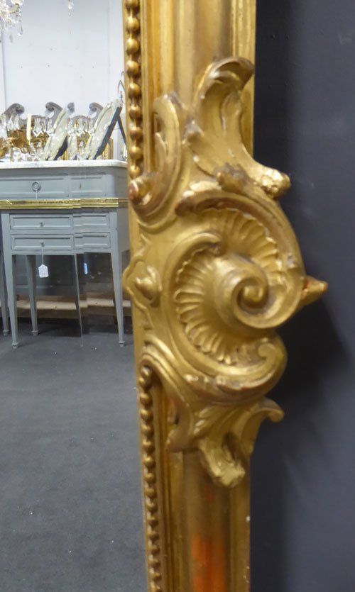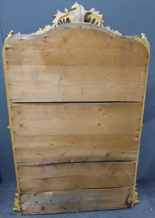 Ref 7383 - Antique French Mirror - Gilt on red Louis XV style camel crested antique mirror. Original bevelled glass with some faint patination spots. Original pine board back. Circa 1890.