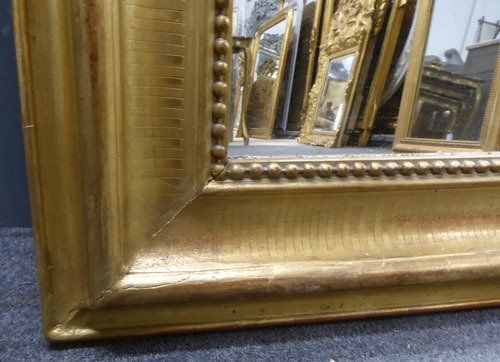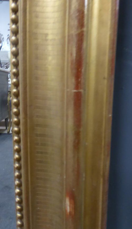 Ref 7385 - Antique French Mirror - Gilt on red camel crested Louis Philippe antique mirror with line etching to inner frame. Gilt worn through to red bole in places. New glass. Original pine board back. Circa 1880.