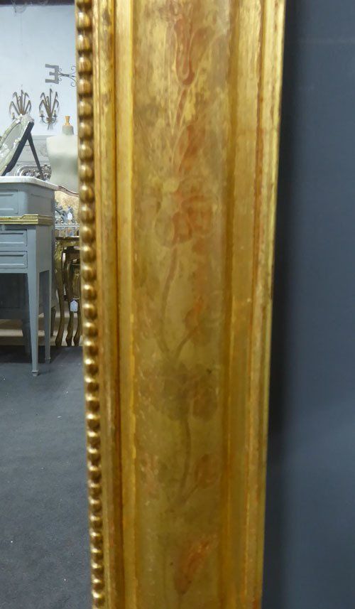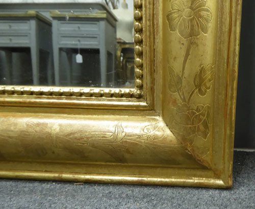 Ref 7389 - Antique French Mirror - Gilt on red period Louis Philippe antique mirror with flower and leaf etching to frame. Original mercury glass. New back. Circa 1840.