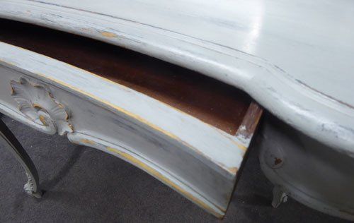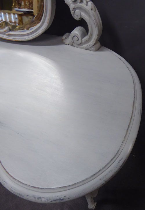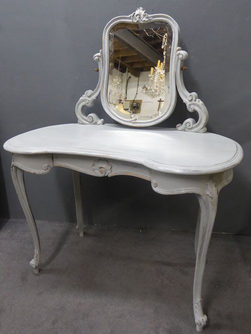 Ref 7392 - Worn grey painted carved wood Louis XV style kidney shaped antique French dressing table with single drawer. Mirror with original bevelled glass. Circa 1900.