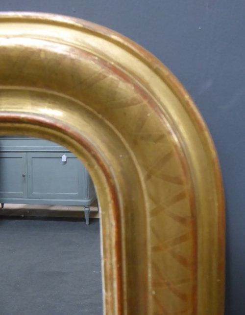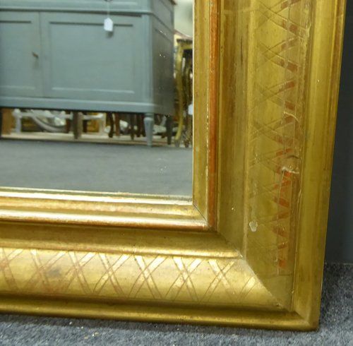 Ref 7393 - Antique French Mirror - Gilt on red Louis Philippe antique mirror with cross hatch etching to frame. Original glass with some faint wipe marks to back of plate. Original pine board back. Circa 1880.