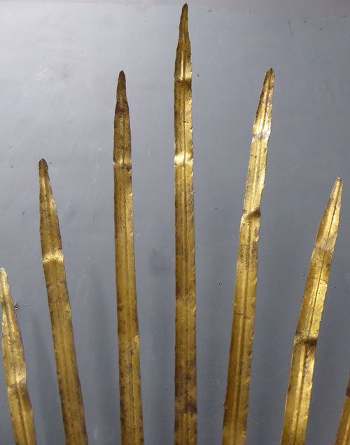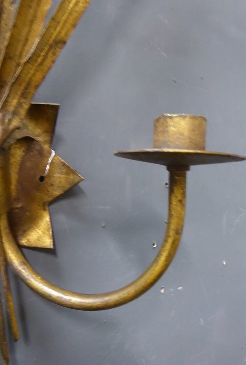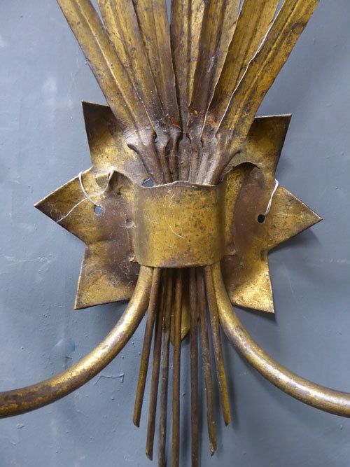 Ref 7394 - Pair of large gilt painted two arm metal bulrush leaf wall lights. Circa 1950.