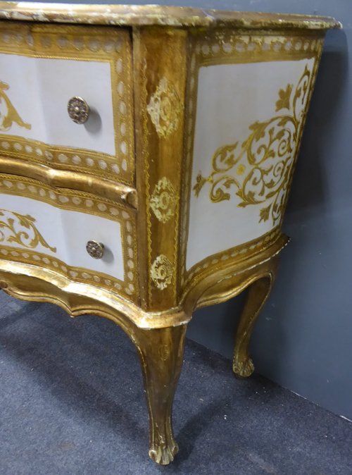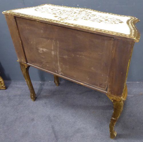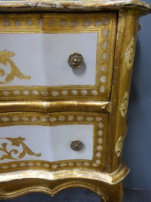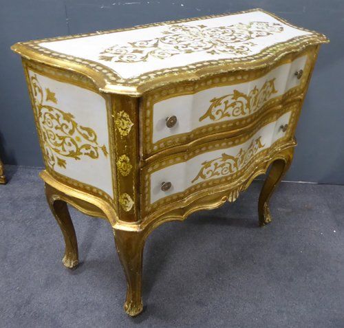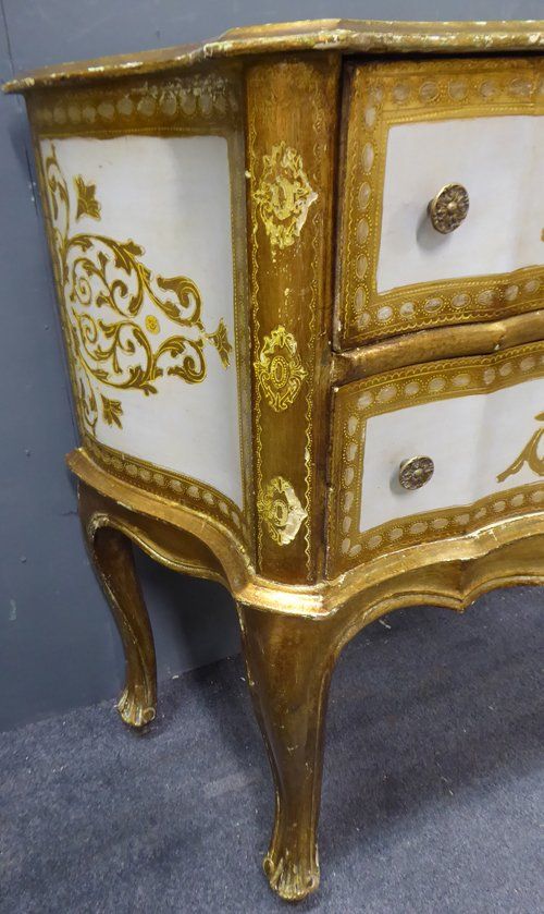 Ref 7398 - Italian Florentine two drawer chest finished in original off-white and gilt embossed decoration. Circa 1950.