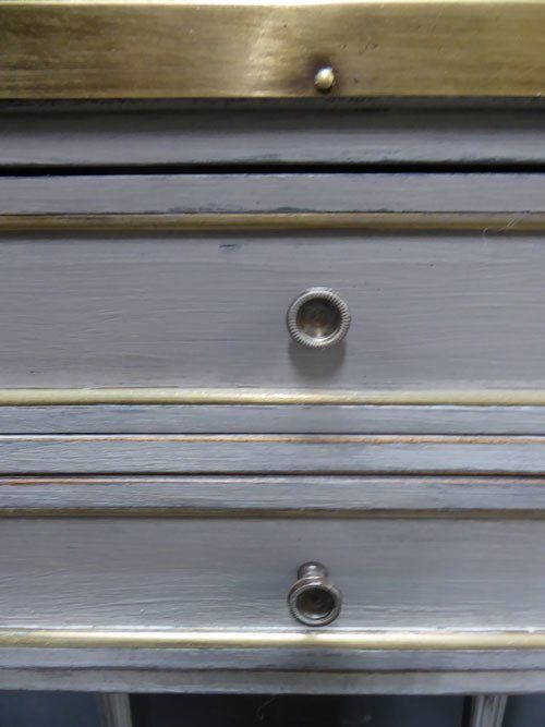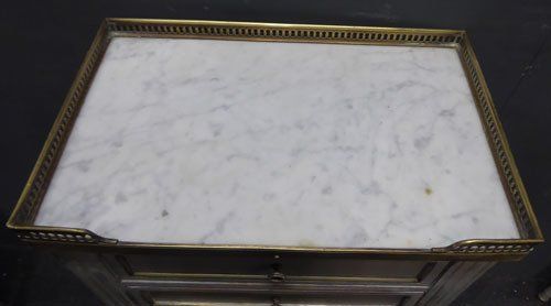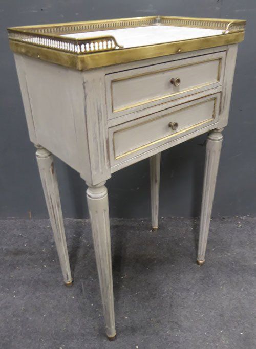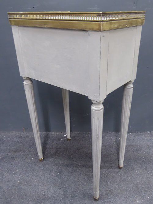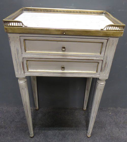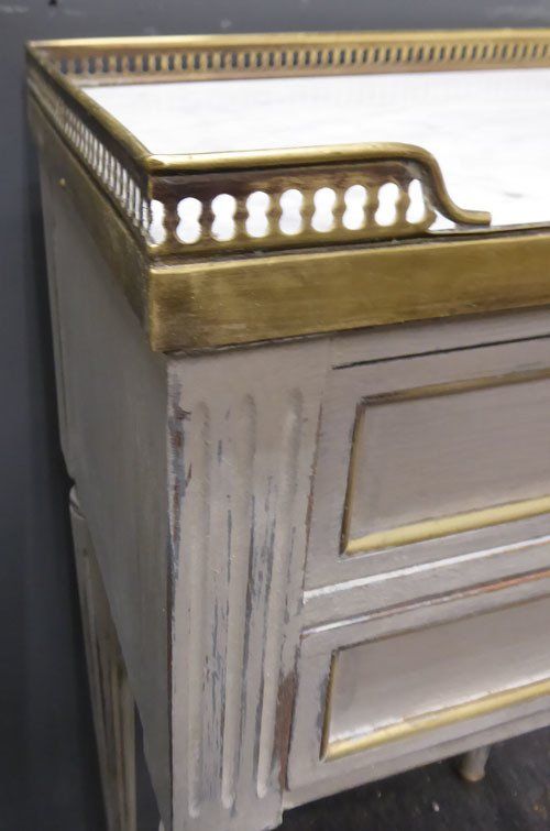 Ref 7411 - Pair of worn grey painted Louis XVI style antique French two drawer bedside cabinets. Original marble tops and fretted brass galleries. Circa 1950.