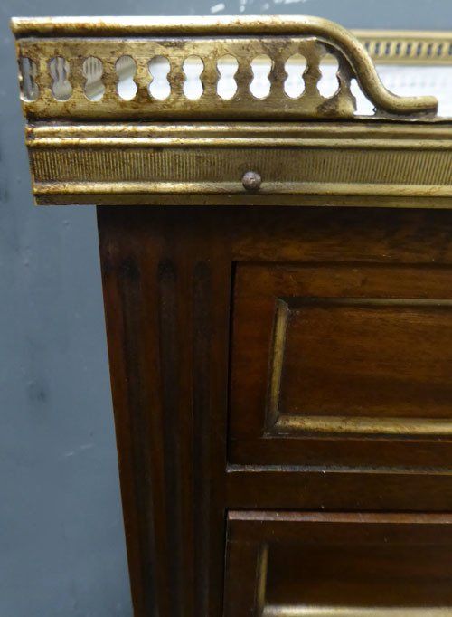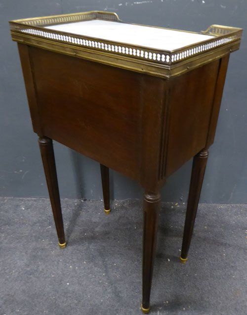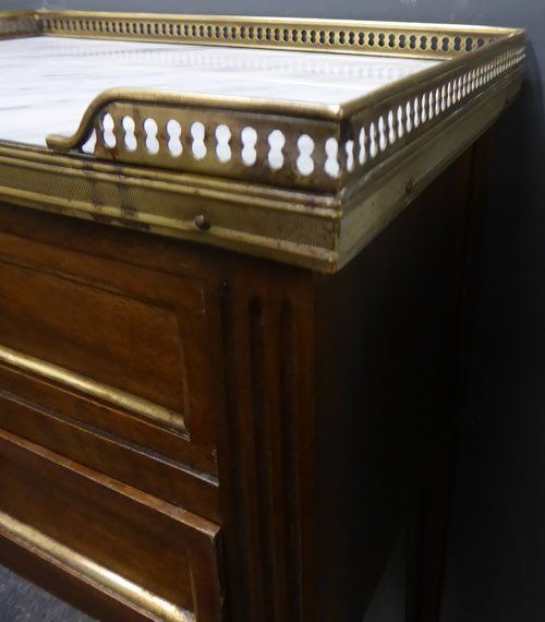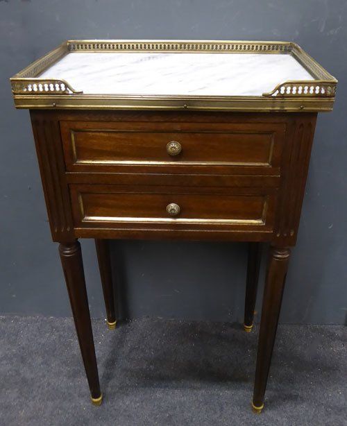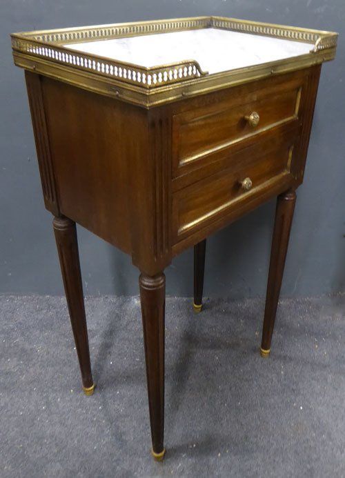 Ref 7413 - Pair of French Louis XVI style two drawer polished mahogany bedside cabinets. Original marble tops and brass fittings. Circa 1950.