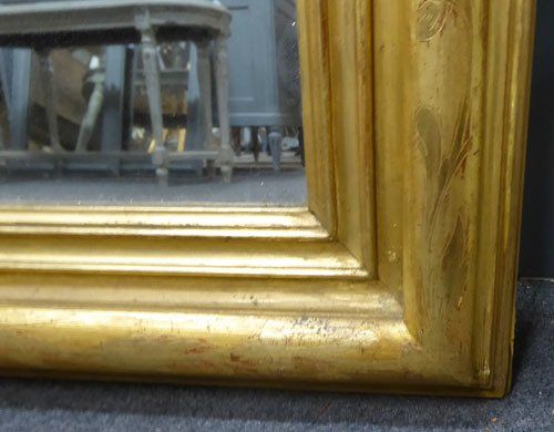 Ref 7416 - Antique French Mirror - Large gilt on red period Louis Philippe antique mirror with flower and leaf etching to frame. Original patinated mercury glass. Original pine board back. Circa 1840.