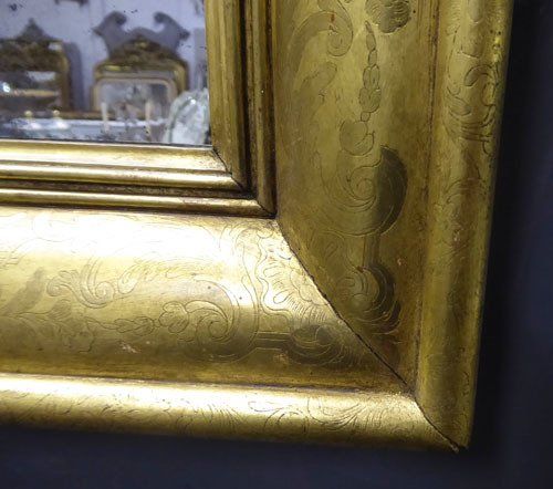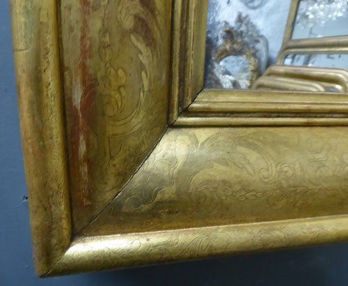 7420 - Antique French Mirror - Small gilt on red Louis Philippe antique mirror with flower and leaf etching to frame. Landscape/portrait. Fitted with patinated mercury glass. Old pine board back. Circa 1840.
