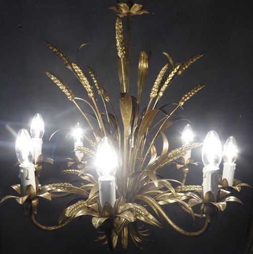 Ref 7422 - Italian 8 arm gilt painted metal wheatsheaf chandelier. Original working wiring and fittings (needs checking). Circa 1950.