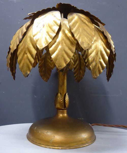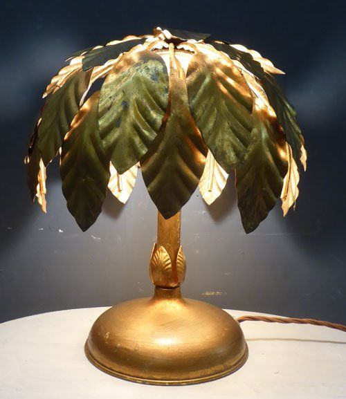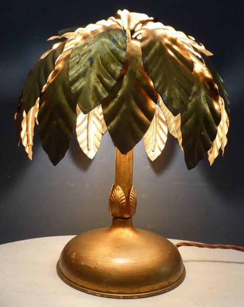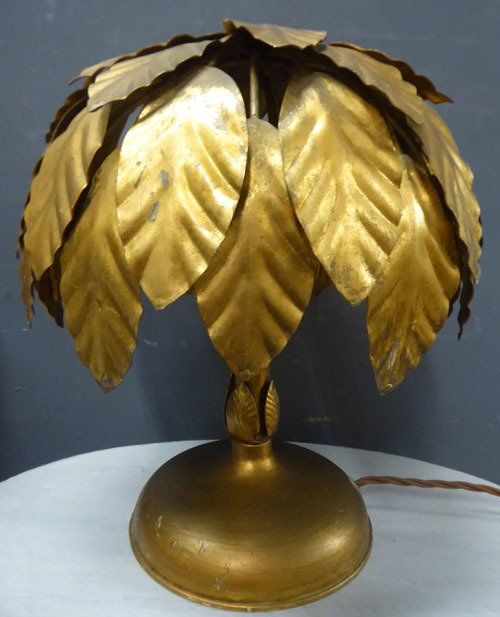 Ref 7425 - Pair of vintage Italian gilt painted metal table lights with leaf decoration. Newly wired and fitted with a switched lampholder. Circa 1950.