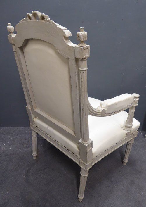 Ref 7432 - Pair of worn grey painted Louis XVI style antique French armchairs ready for recovering. Circa 1900.