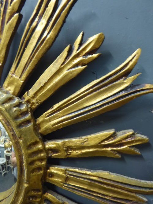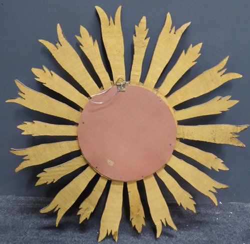 Ref 7435 - Vintage French carved giltwood sunburst mirror with original convex glass. Circa 1950.