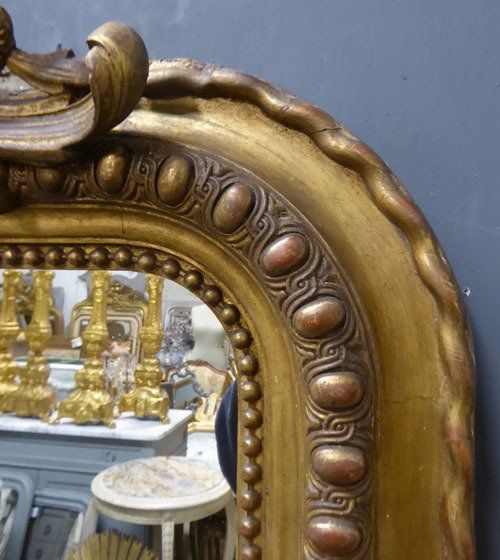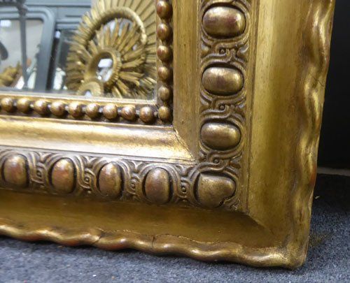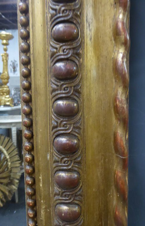 Ref 7444 - Antique French Mirror - Large gilt on red Napoleon III crested antique mirror finished in original worn two tone gilt. Original glass with some faint manufacturing wipe marks to back of plate. Original pine board back. Circa 1870.