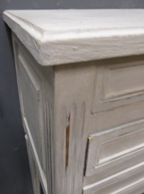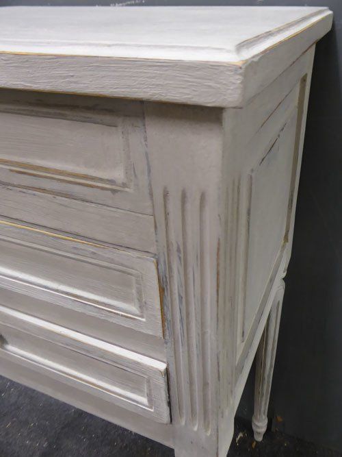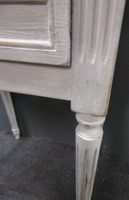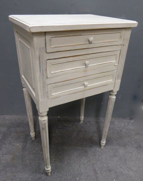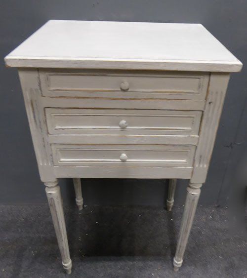 Ref 7446 - Pair of worn grey painted Louis XVI style vintage French three drawer bedside cabinets. Circa 1950.