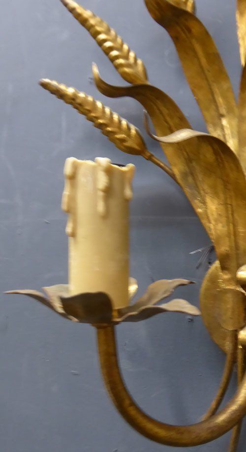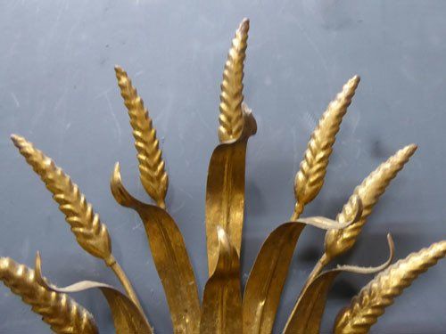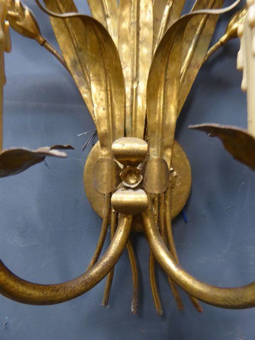 Ref 7456 - Pair of vintage French gilt painted metal wheatsheaf wall lights. Two arms. Working original wiring (needs checking). Circa 1970.