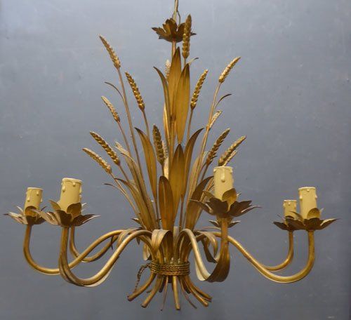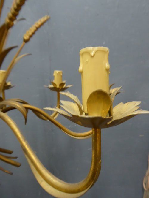 Ref 7457 - 8 arm gilt painted metal wheatsheaf vintage French chandelier. Original working wiring (needs checking). Circa 1970.