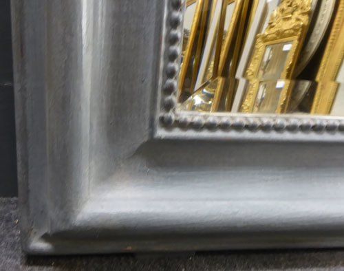 Ref 7458 - Antique French Mirror - Worn grey painted camel crested Louis Philippe antique mirror. Original bevelled glass with some small black patination spots. Original pine board back. Circa 1890.
