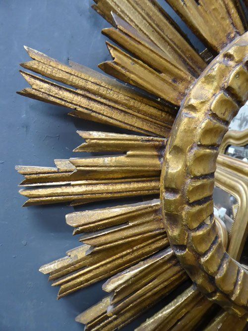 Ref 7460 - Large double ray carved giltwood sunburst mirror. Original glass. Circa 1950.