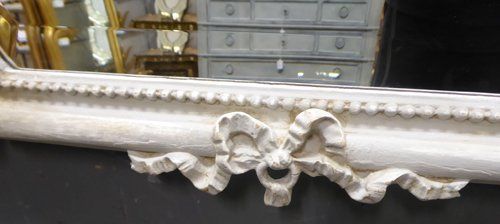 Ref 7467 - Antique French Mirror - Worn grey painted Louis XVI style double crested antique mirror. Original bevelled glass. Original pine board back. Circa 1890.