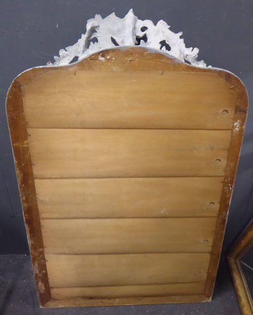 Ref 7469 - Antique French Mirror - Worn grey painted Napoleon III camel crested antique mirror with gesso decoration to frame. Original glass with some small surface scratches. Original pine board back. Circa 1870.