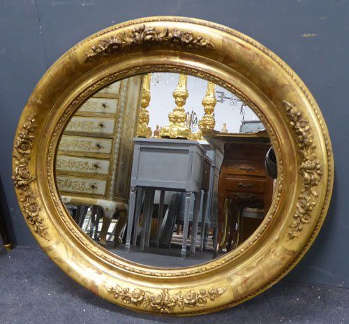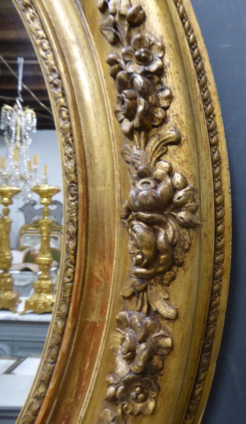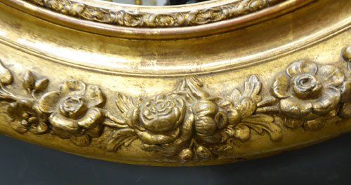 Ref 7474 - Antique French Mirror - Gilt on red Louis Philippe oval antique mirror with etched bands and gesso decoration to frame. Landscape/portrait. Fitted with old glass with some small patinated areas. Old cardboard back. Circa 1850.