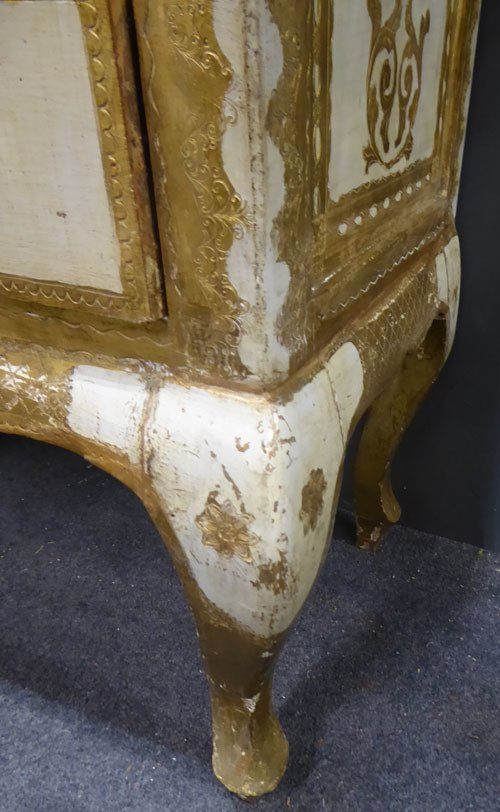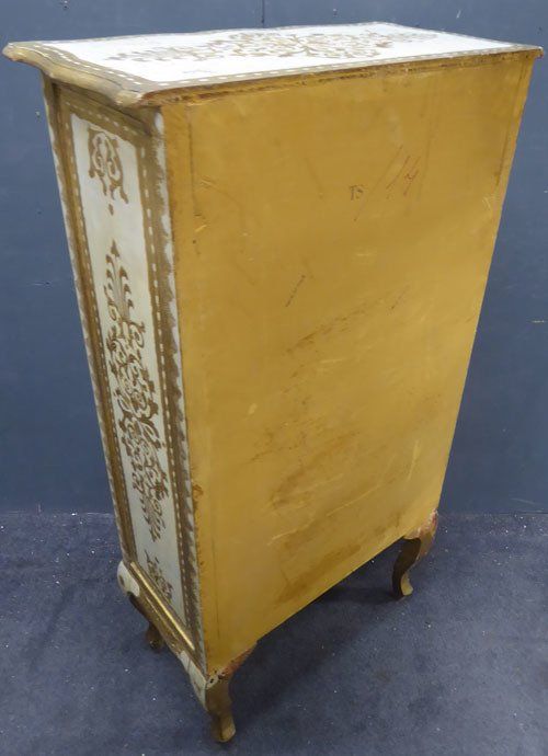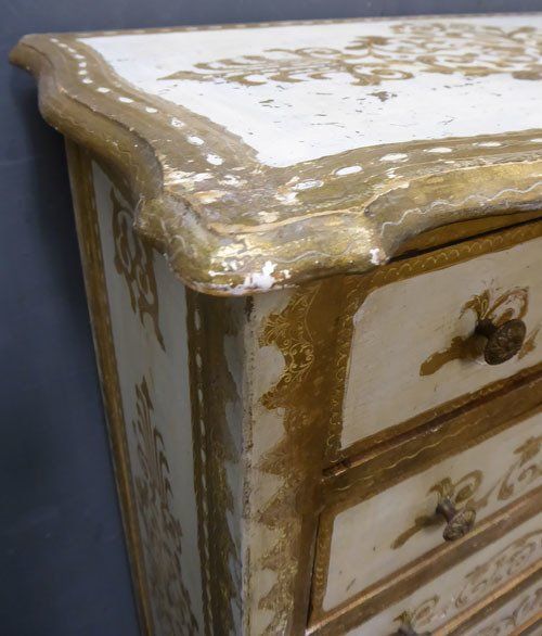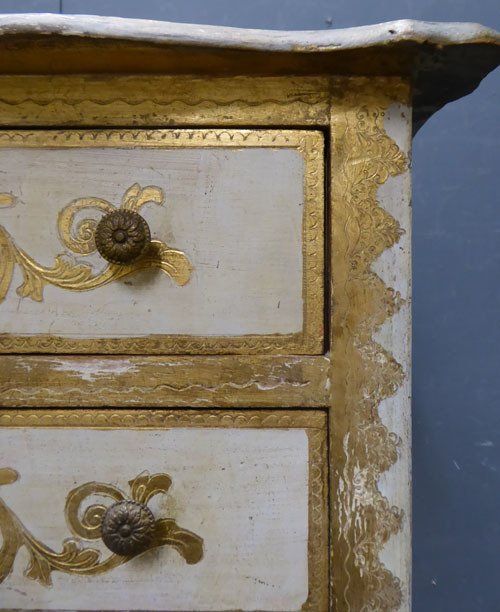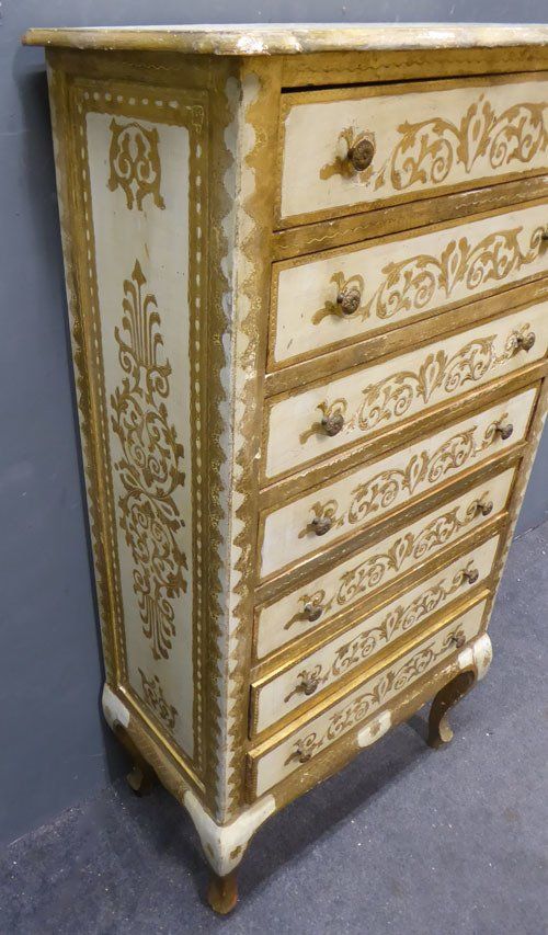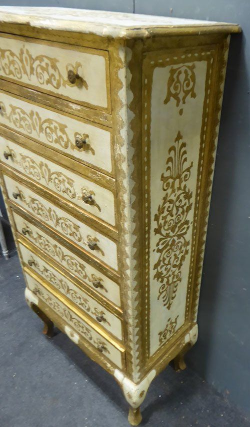 Ref 7477 - Vintage Italian Florentine seven drawer semainier chest of drawers finished in original off-white paint with gilt embossed decoration. Circa 1950.