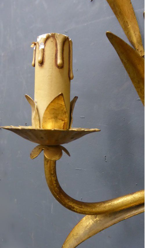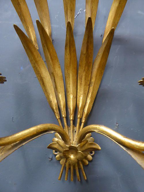 Ref 7480 - Pair of vintage Italian two arm gilt painted metal wheatsheaf wall lights. Original wiring (needs checking). Circa 1950.
