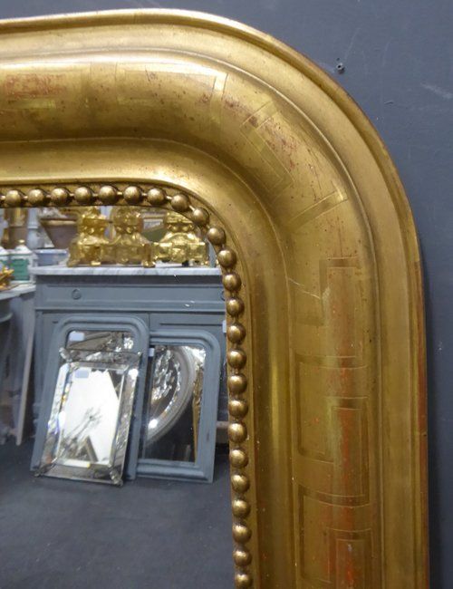 Ref 7482 - Antique French Mirror - Gilt on red period Louis Philippe antique mirror with Greek key etching to frame. Original mercury glass. Original pine board back. Circa 1840.