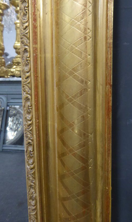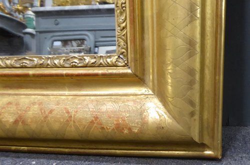 Ref 7483 - Antique French Mirror - Gilt on red period Louis Philippe antique mirror with cross hatch etching to frame. Some old restoration to right hand edge. Original mercury glass. Original pine board back. Circa 1840.