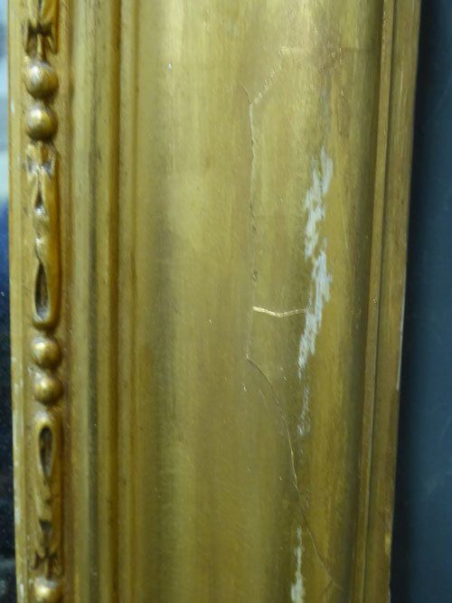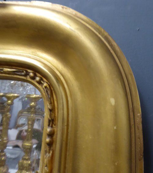 Ref 7488 - Antique French Mirror - Period gilt crested Louis Philippe antique mirror. Some old repairs and shrinkage cracks to frame. Original mercury glass. Original pine board back. Circa 1840.