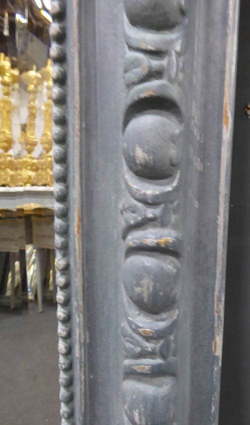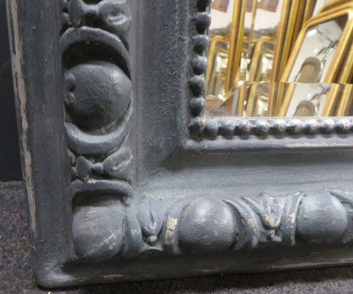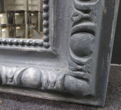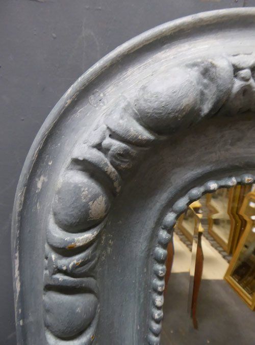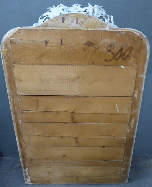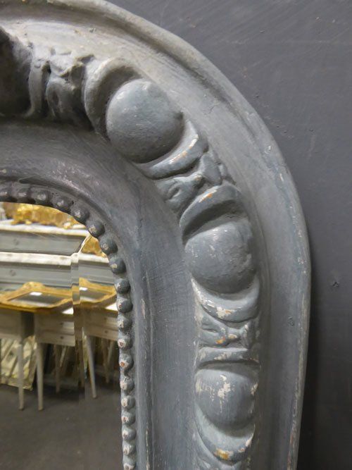 Ref 7489 - Antique French Mirror -Worn grey painted camel crested antique mirror with gesso decoration to frame. Original faintly mottled bevelled glass. Original pine board back. Circa 1890.