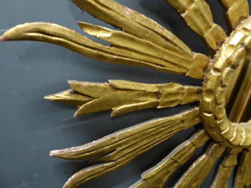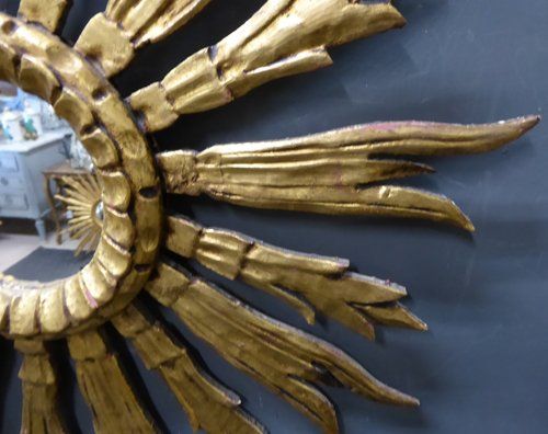 Ref 7500 - Large vintage French carved giltwood sunburst mirror with original glass. Circa 1950.