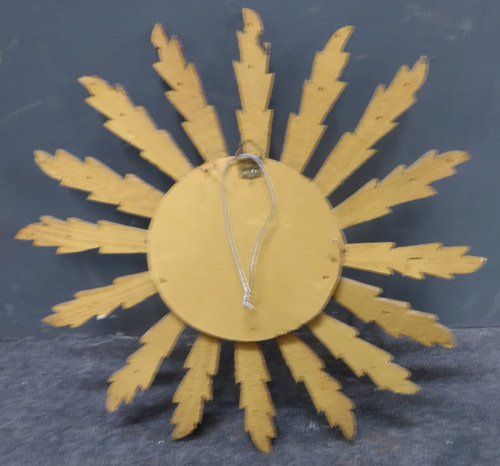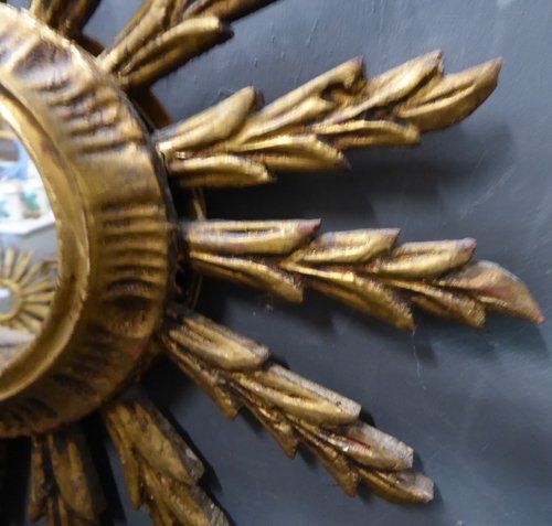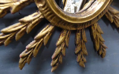 Ref 7502 - Vintage French carved giltwood sunburst mirror with original glass. Circa 1950.