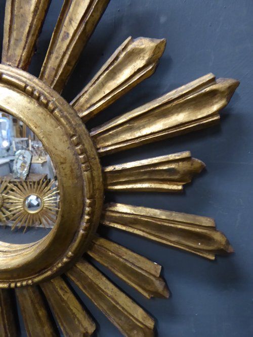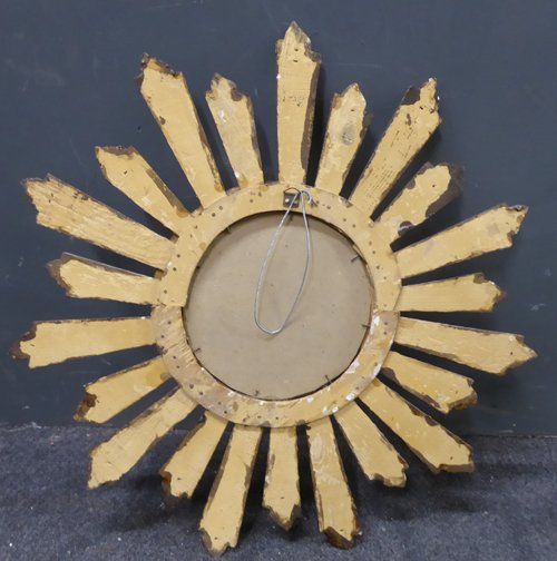 Ref 7503 - Vintage French carved giltwood sunburst mirror with original glass. Circa 1950.