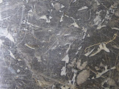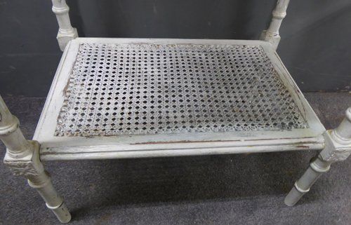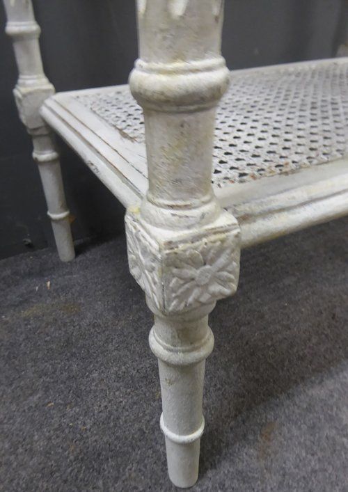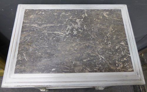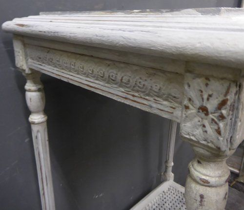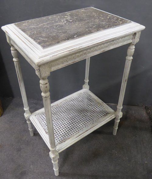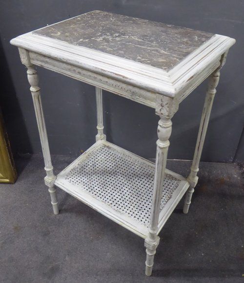 Ref 7505 - Worn grey painted antique French side table. Original grey marble with faint surface scratches. Cane panel to bottom. Circa 1900.