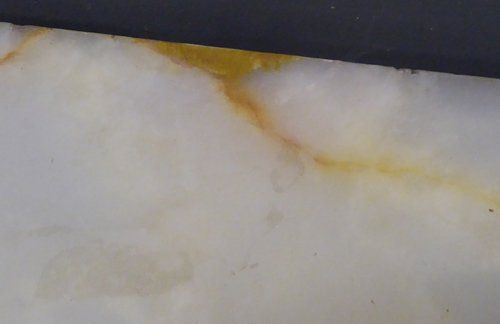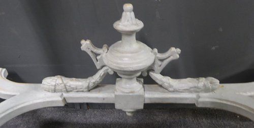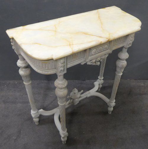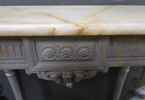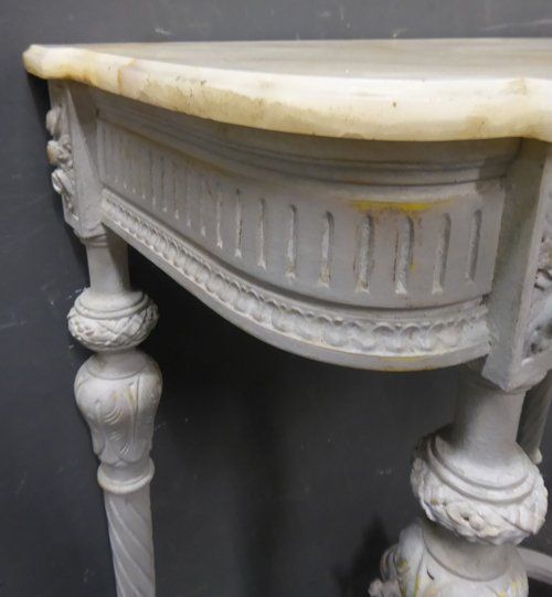 Ref 7515 - Worn grey painted Louis XVI style carved wood antique French console table with original shaped marble top. Some small repairs and chips to back edge of marble (see close-ups). Circa 1900.