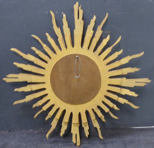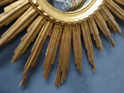 Ref 7527 - Large vintage French carved giltwood sunburst mirror with original glass. Circa 1950.