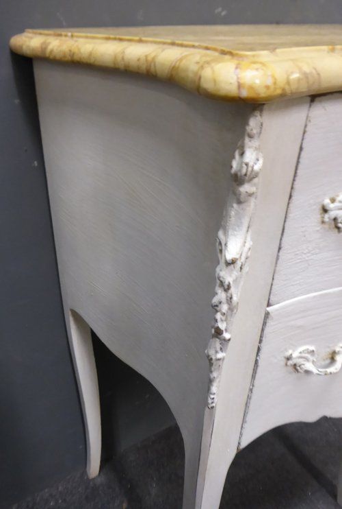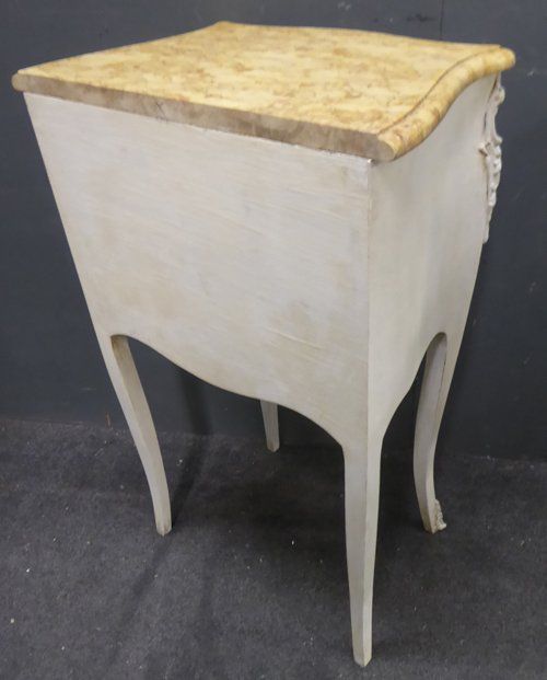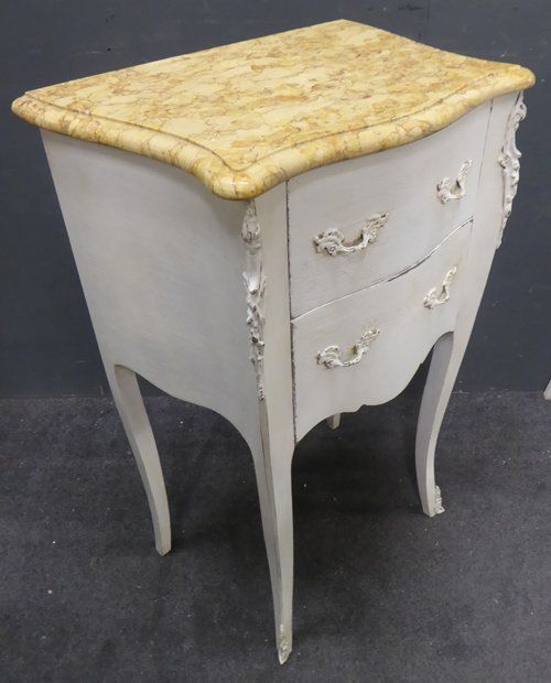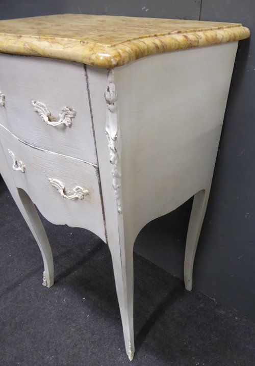 Ref 7530 - Pair of off-white painted French Louis XV style two drawer bedside cabinets with original shaped marble tops. Circa 1950.