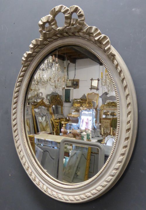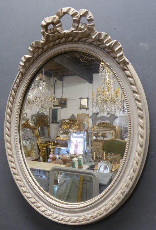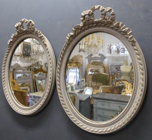 Ref 7533 - Pair of Antique French Mirrors - Pair of worn grey painted Louis XVI style ribbon crested oval mirrors fitted with old glass. Original cardboard backs. Circa 1900.