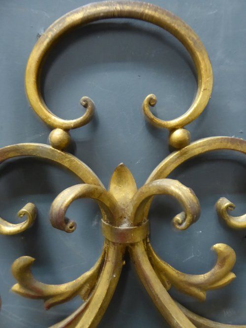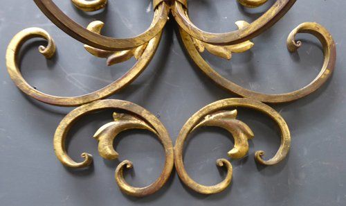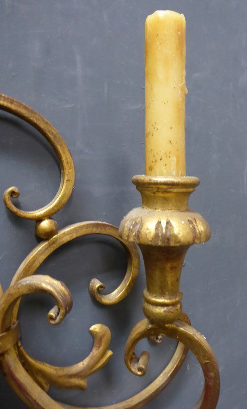 Ref 7535 - Pair of vintage French gilt painted metal two arm wall lights with carved giltwood candle holders. Not wired. Circa 1960.