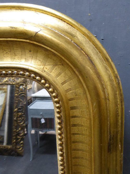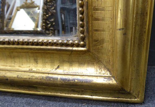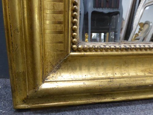 Ref 7542 - Antique French Mirror - Gilt on black Louis Philippe antique mirror with line etching to frame. Original glass. Original pine board back. Circa 1880.