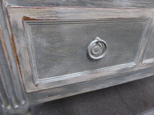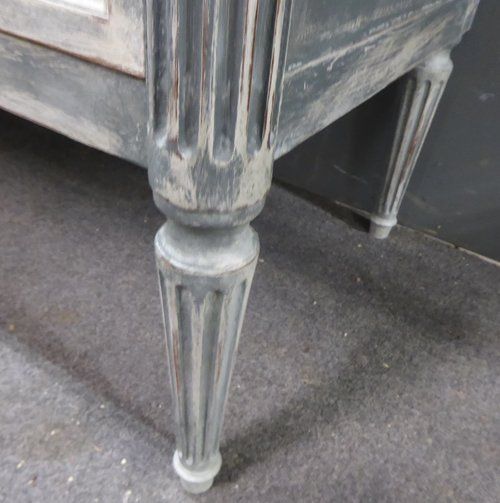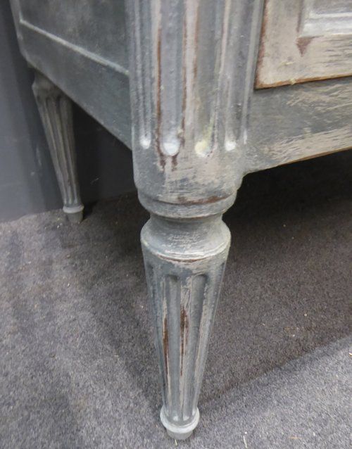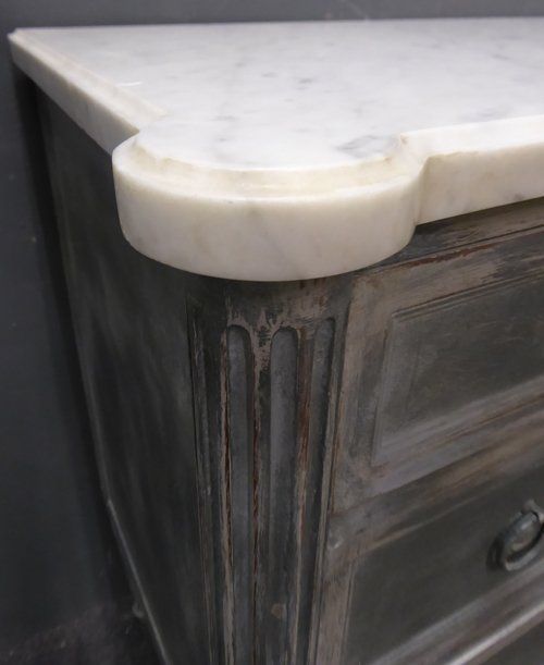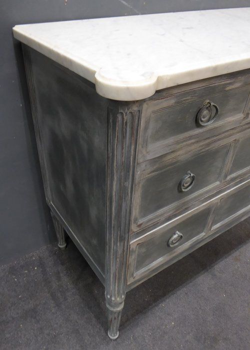 Ref 7545 - French Louis XVI style worn grey painted three drawer commode chest of drawers Original marble top. Circa 1950.